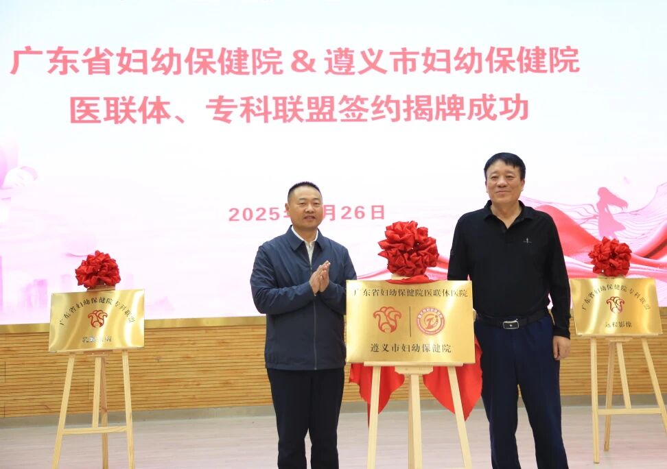 9月26日,广东省妇幼保健院与遵义市妇幼保健院医联体、专科联盟签约揭牌仪式在遵义市妇幼保健院新蒲院区举行。仪式后,遵义市妇产科热点问题学术研讨会与两地专家大型义诊顺利召开,来自粤黔两地的百余名专家、学者及医务工作者共聚一堂,共话妇幼健康事业高质量发展。